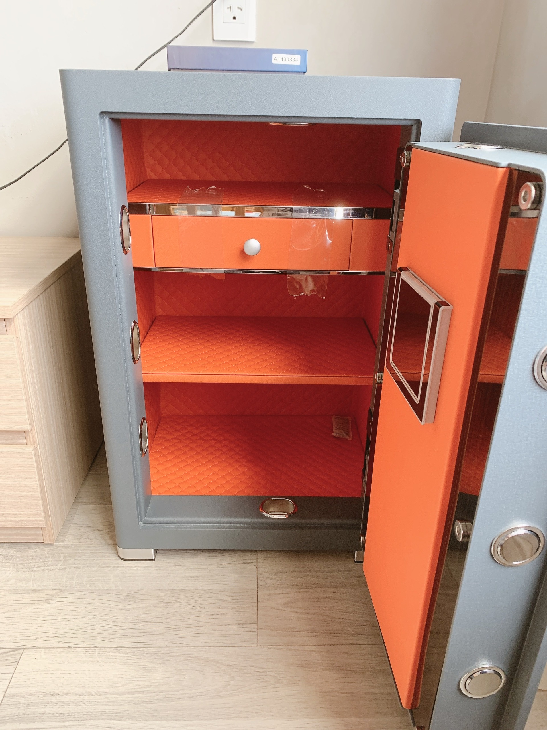 Bên trong két sắt thông minh Philips SBX701-7B0 được thiết kế với nội thất bọc da PU cao cấp màu cam hiện đại, phối hợp hoàn hảo với lớp sơn xám bạc bên ngoài và viền kim loại sang trọng. Lớp da này vô cùng mềm mại và có độ hoàn thiện cao, giúp bảo vệ đồng hồ, trang sức đắt tiền hay tài sản giá trị cao của bạn khỏi nguy cơ bị trầy xước hay móp méo khi cất giữ bên trong két.